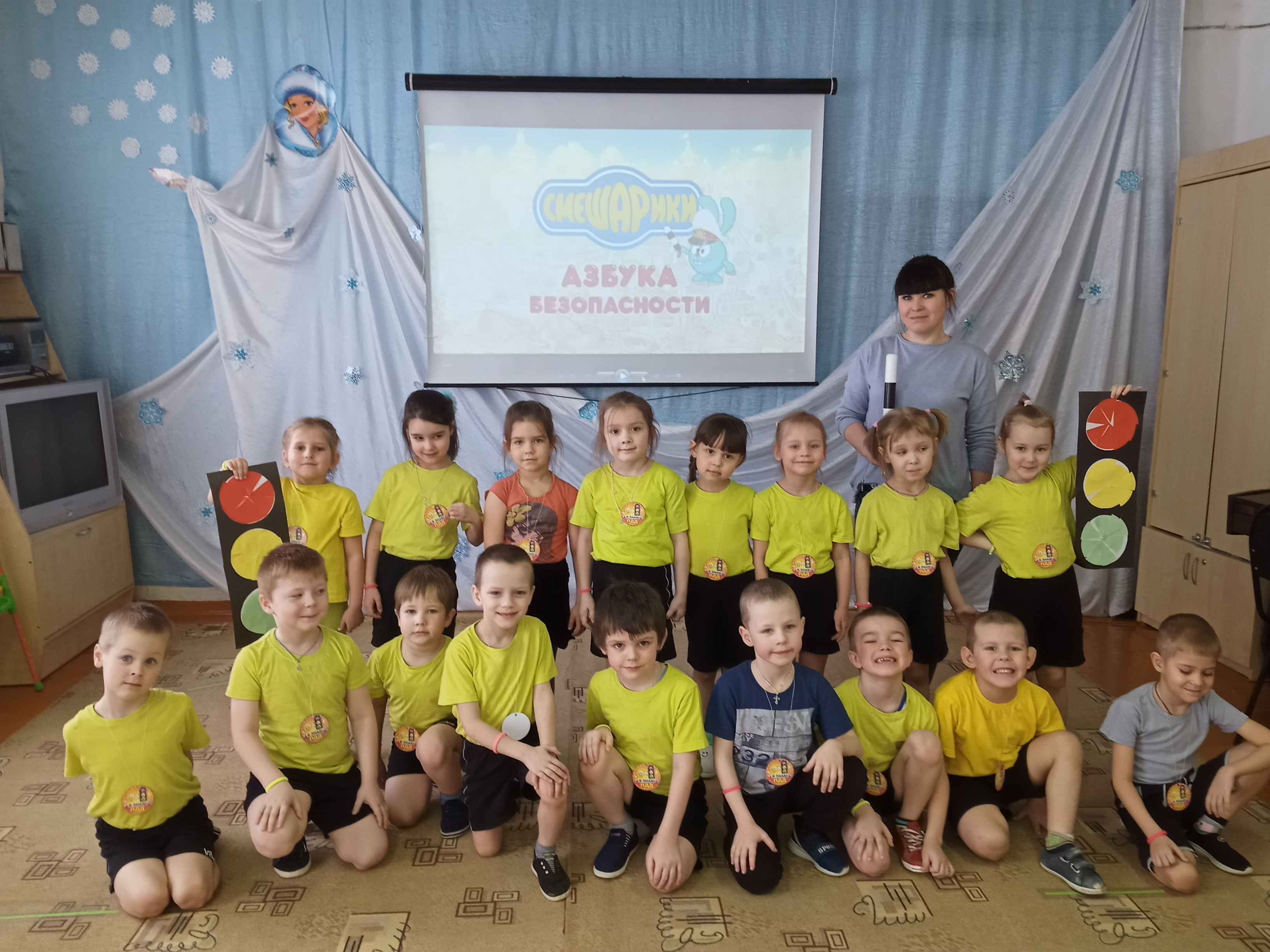 Воспитанники посмотрели поучительный мультфильм, отгадывали загадки, отвечали на вопросы, играли в весёлые игры. Вспомнили правила дорожного движения, названия дорожных знаков и сигналов светофора.